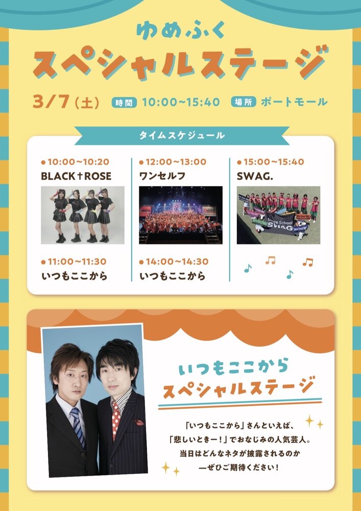 『ゆめタウン福山 ゆめふくスペシャルステージ』にBLACK†ROSEが出演 SCHEDULE 2026/03/07(土) 10:00 - 3月7日 土曜日 10時〜『ゆめタウン福山 ゆめふくスペシャルステージ』にBLACK†ROSEが出演します。出演後、CD販売もあるのでぜひお越しください。 URLをコピーする 報告する